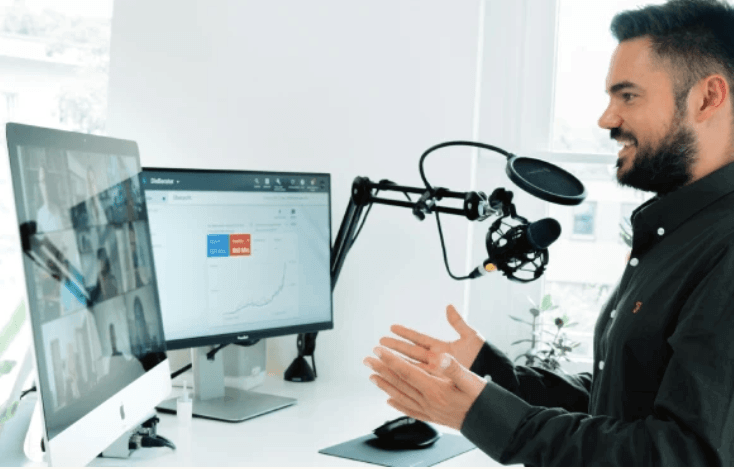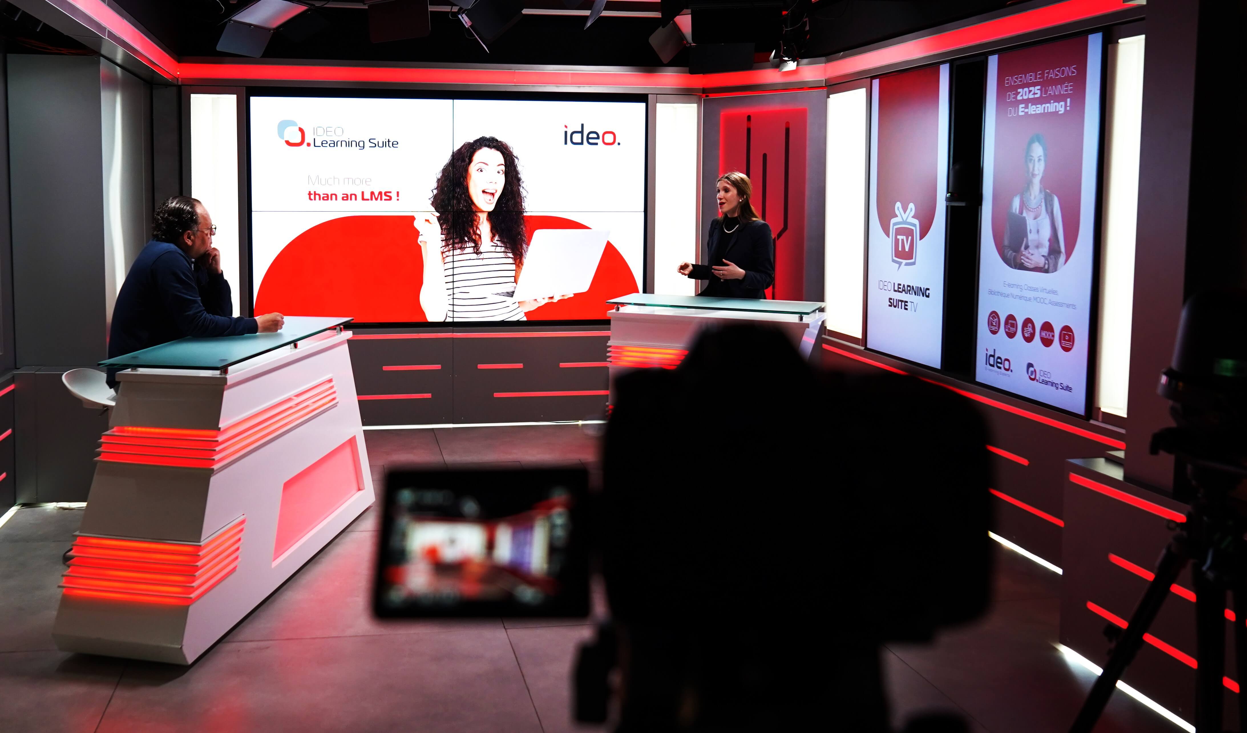 Émissions filmées dans notre plateau TV professionnel avec décors modulables. Panels d'experts, interviews, tables rondes — un format idéal pour valoriser l'expertise interne et créer de l'engagement.