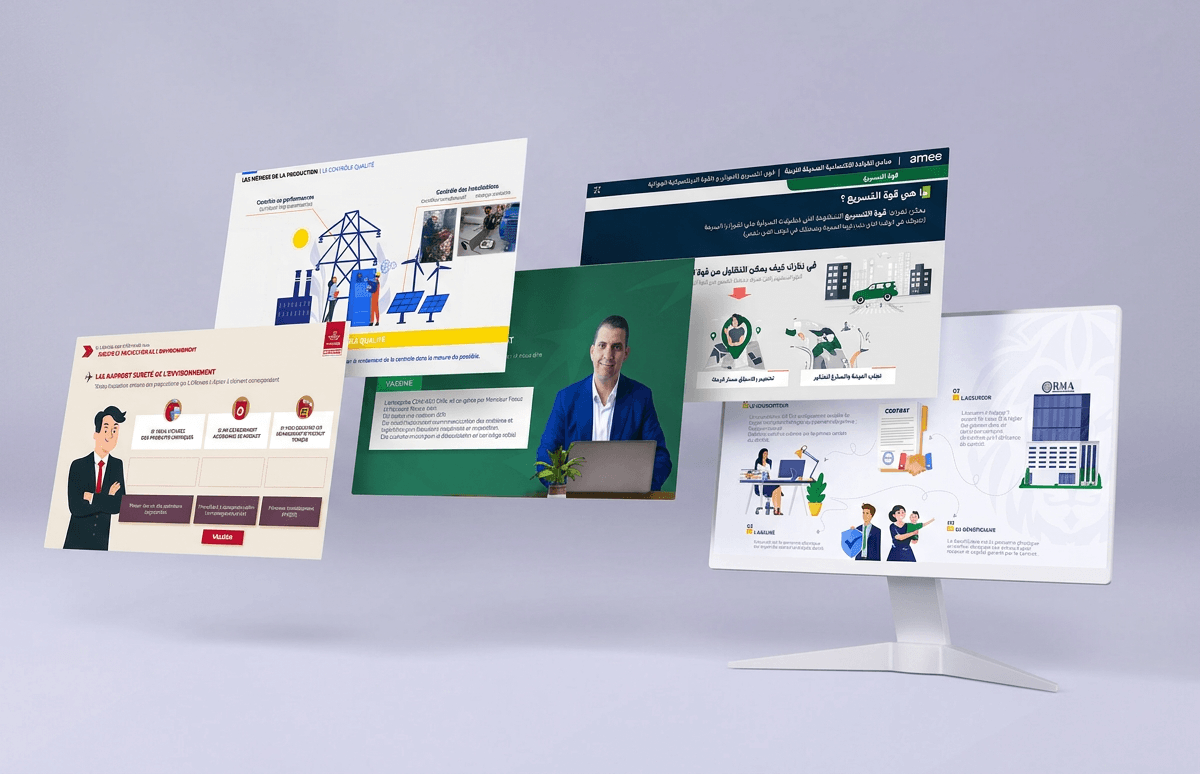Modules scénarisés avec trame narrative, personnages, mises en situation réalistes, quiz adaptatifs et feedback intégrés. Chaque module est conçu sur mesure à partir de votre contexte métier et livré au format SCORM.